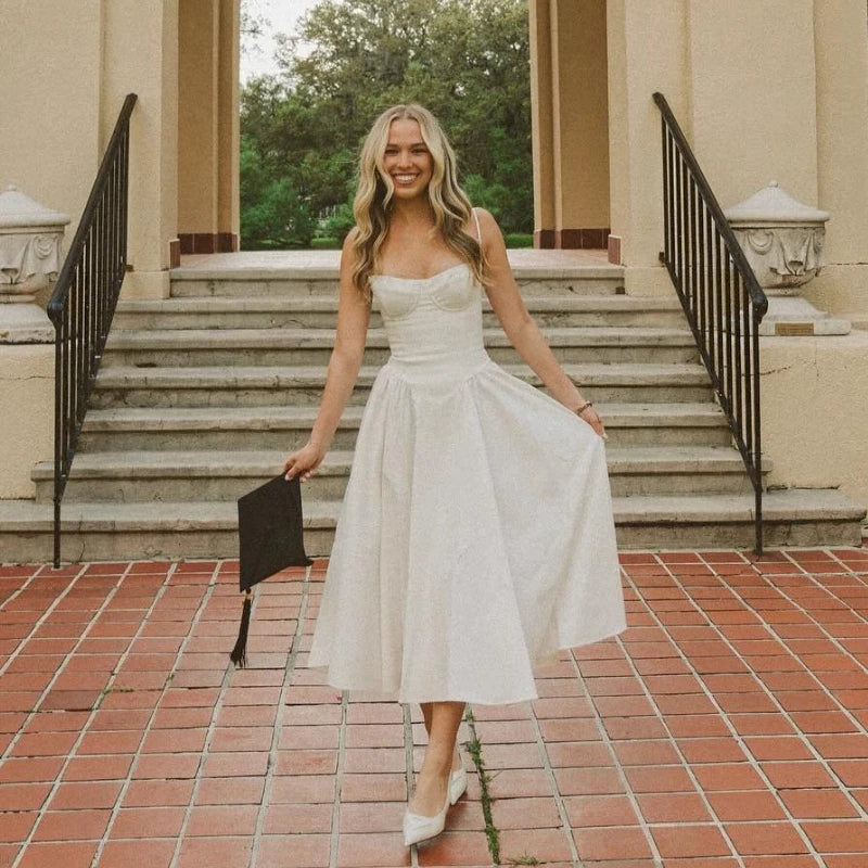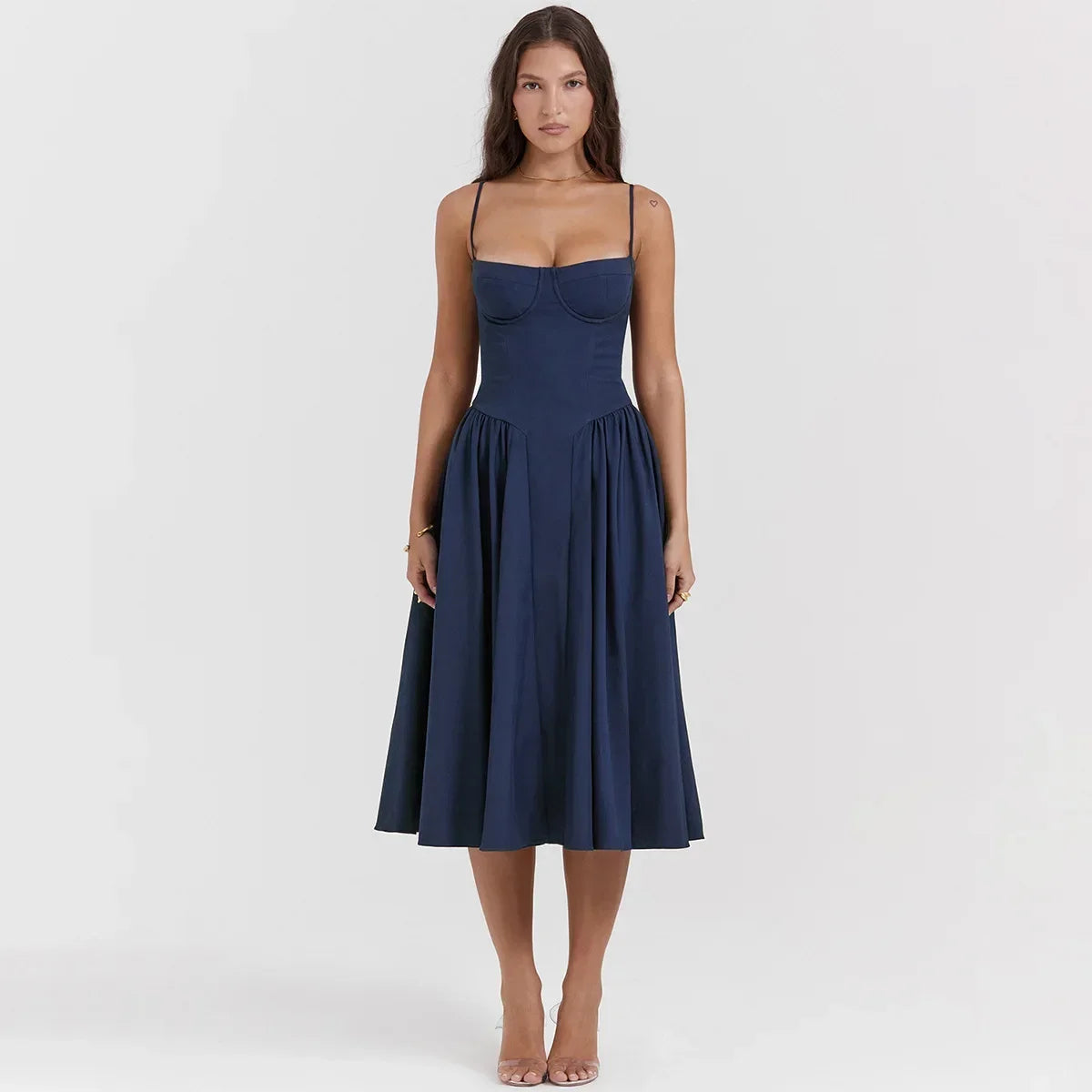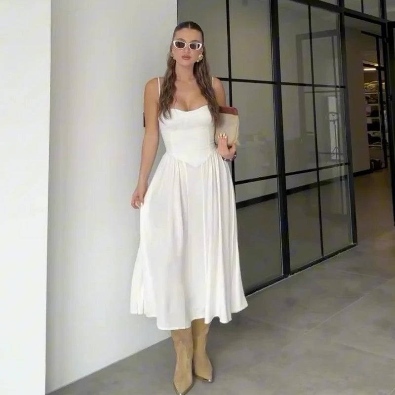 The delicate straps and clean neckline enhance the minimalist appeal, while the midi length adds sophistication, making it ideal for summer occasions, dinners, celebrations, or stylish daytime events. Crafted from a lightweight, breathable fabric, this dress offers comfort without compromising on elegance.